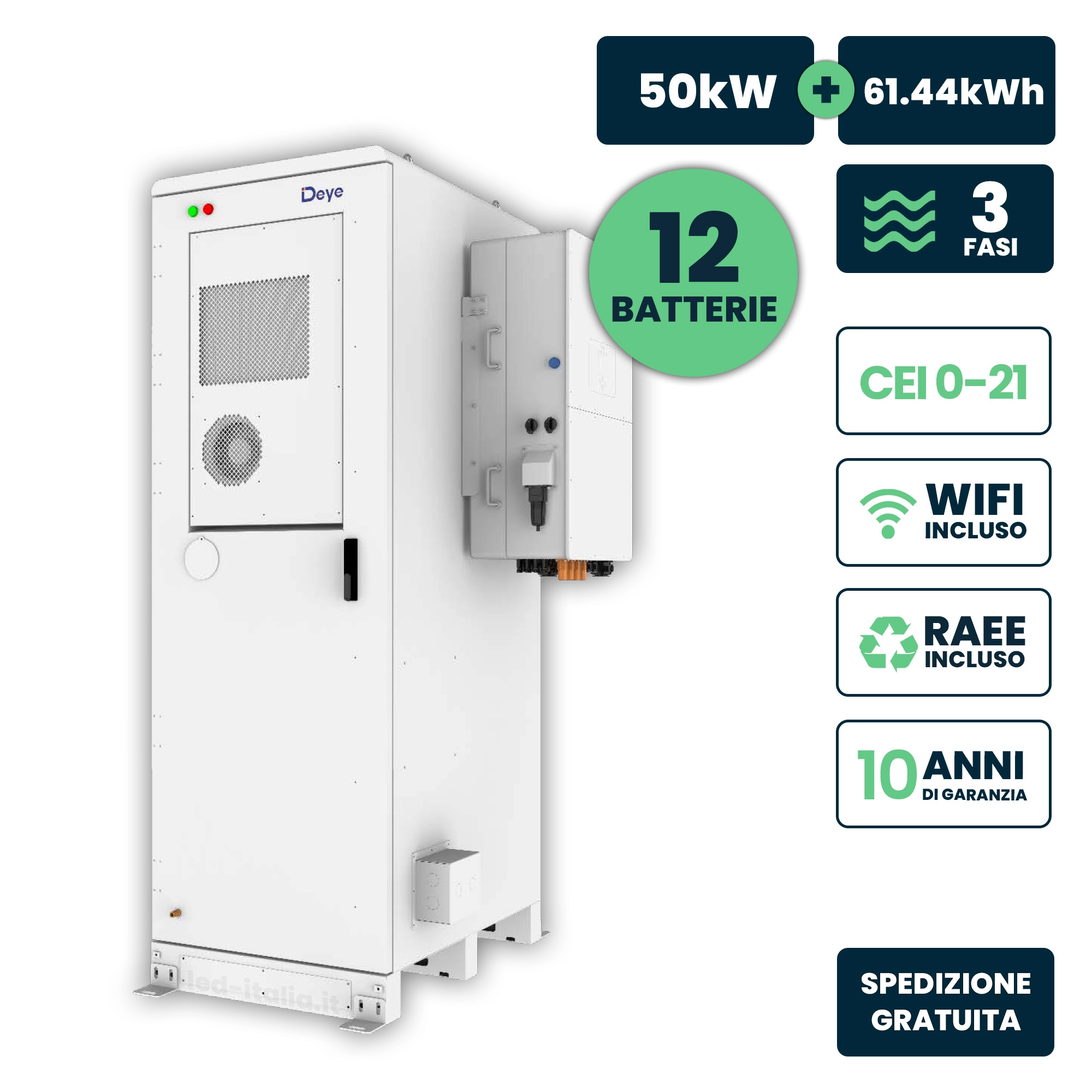 Inverter fotovoltaico alta tensione deye trifase ibrido on-grid/off-grid 50kw, quadruplo mpppt, cei 0-21, schermo lcd touch, wifi e ta inclusi, garanzia 10 anni ip65