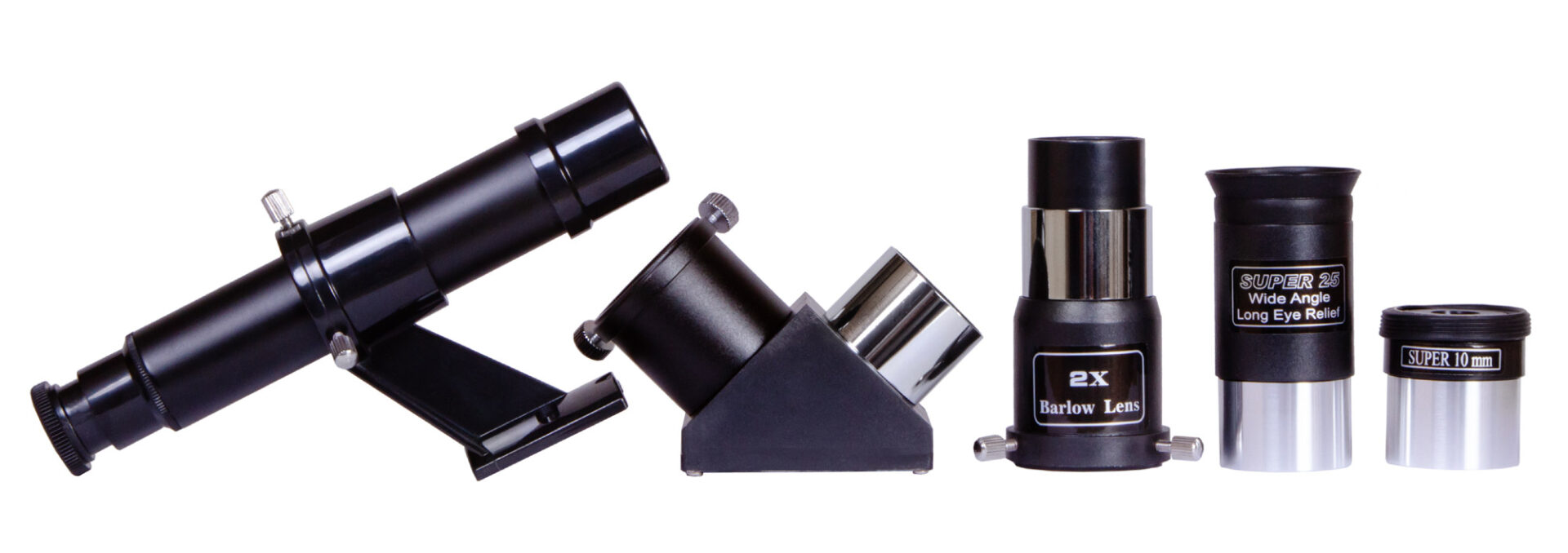 Gli accessori sono la caratteristica principale di questo modello di telescopio. Sono scelti in modo da valorizzare tutte le capacità di tale strumento ottico. L’utilizzo di un oculare a focale corta abbinato alla lente di Barlow consente di raggiungere il massimo ingrandimento utilizzabile, che permette quindi di osservare gli oggetti distanti con grande nitidezza e in tutti i loro dettagli. L’oculare a focale lunga è invece più adatto allo studio di oggetti di grandi dimensioni. La diagonale a specchio fornisce l’opportunità di osservare panorami terresti nel modo più confortevole possibile.
