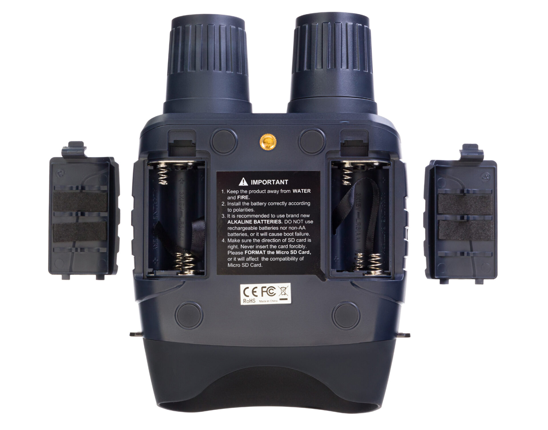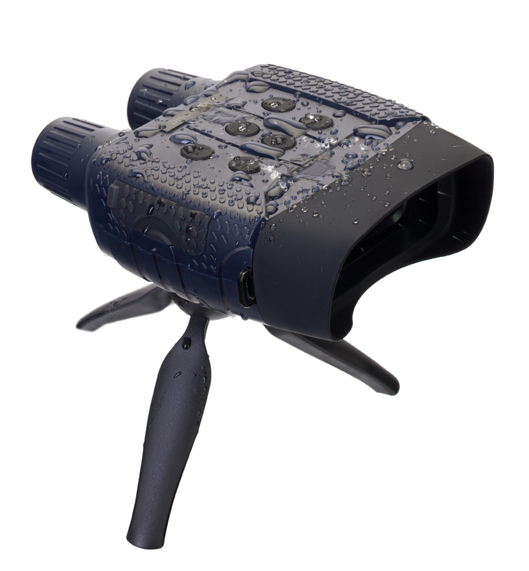Il binocolo offre una presa ben salda, i pulsanti di controllo sono posizionati proprio sotto le dita dell’utente, per il massimo comfort, particolarmente importante durante le osservazioni notturne. Il corpo è impermeabile e resistente alla polvere e allo sporco. Un set di batterie standard è l’alternativa migliore a una batteria ricaricabile tramite rete elettrica: le batterie sono più facili da sostituire sul campo, se dovessero scaricarsi. Le batterie garantiscono un’autonomia dalle 4 alle 10 ore (a seconda dell’intensità della luce IR). Nel kit è incluso un piccolo treppiede, che consente di posizionare il binocolo in qualsiasi luogo per osservazioni più comode.
