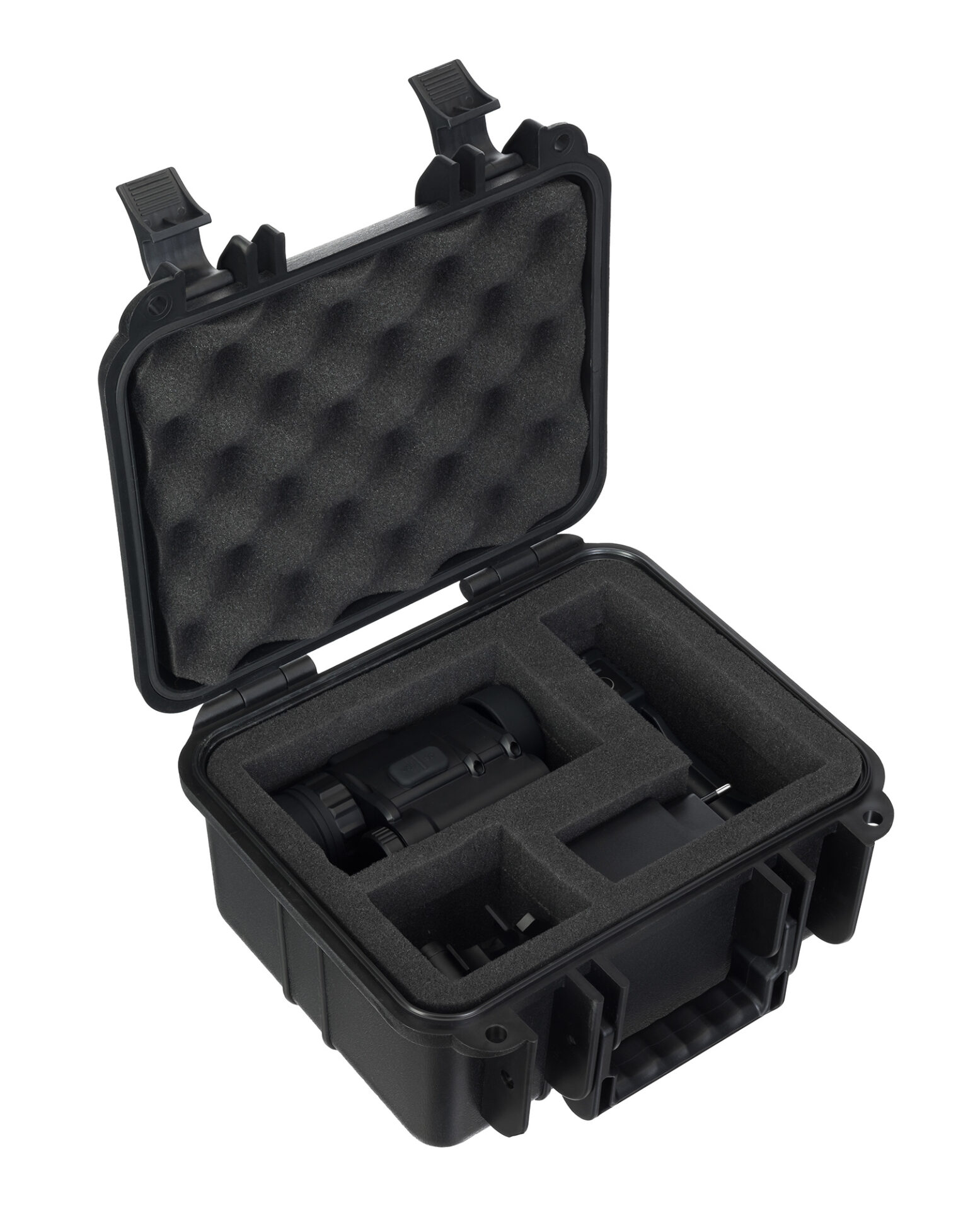 Il telaio è realizzato in plastica ABS migliorata ed è altamente durevole e resistente ai danni. Il grado di impermeabilità IP67 permette di utilizzare il monocolo in condizioni atmosferiche nuvolose o di pioggia. Per facilità d’uso, il kit comprende un supporto per casco.